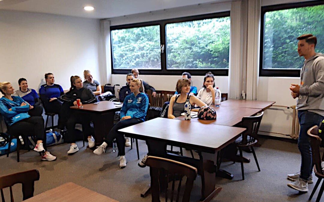 Die Hallenschließung wurde für eine besondere Trainingseinheit genutzt: Neben der körperlichen stellt auch die mentale Fitness einen wichtigen Baustein für ein erfolgreiches Spiel in der komplexen Sportart Handball dar. Lukas Klee von der Handballschule Baden führte Trainerinnen, Trainer und Spielerinnen in die Problematik ein. Im theoretischen Teil und den Übungen ging es viel um Annäherungsziele, Vermeidungsziele, Mottoziele, Vermeidungsstrategien und die SMART-Methode. Die Übungen zur „Mind Gym“, dem Gehirntraining, waren dann doch ziemlich herausfordernd und machten klar, was man neben dem Training auf dem Spielfeld sonst noch machen kann, um seine „Komfortzone“ zu vergrößern.