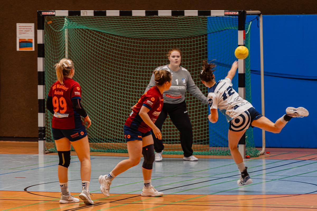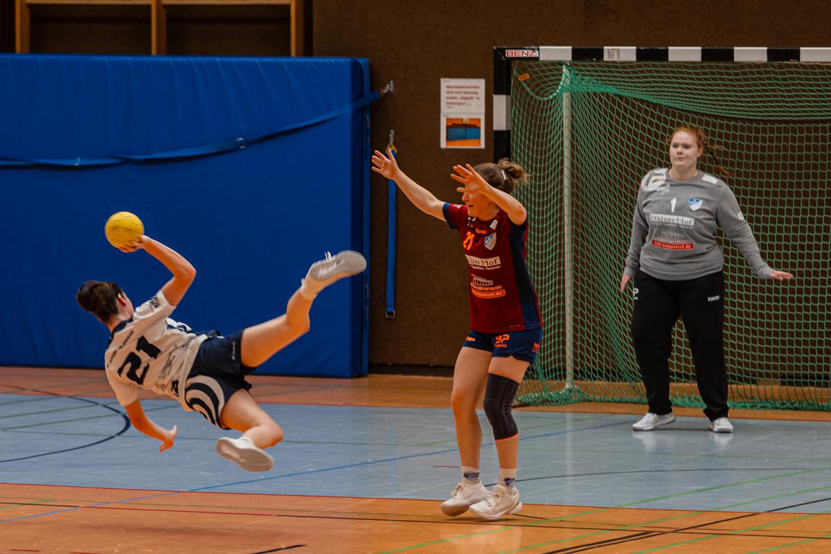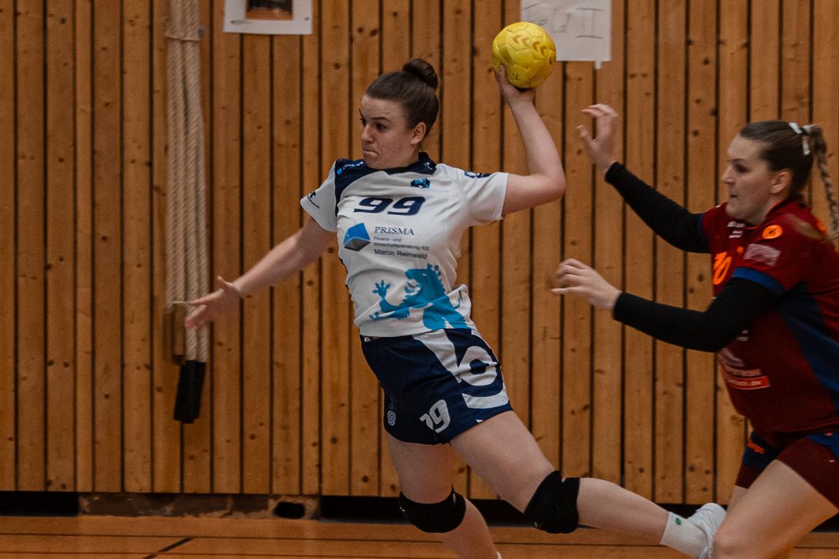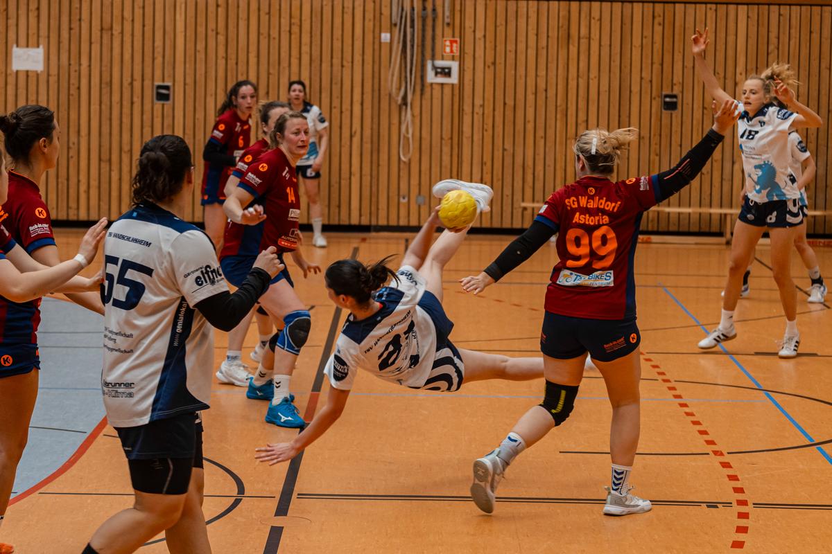 So dauerte die in den letzten Spielen schon gewohnte anfängliche „Eingewöhnungsphase“ praktisch bis zum Halbzeitpfiff. Die Abwehr hatte erhebliche Schwierigkeiten mit den guten 1:1-Aktionen und den starken Rückraumwerferinnen der Gäste, so dass schon nach vier Minuten ein 1:4-Rückstand zu Buche stand. Zwar gelang unserer Mannschaft beim 6:6 und 7:7 Mitte der ersten Halbzeit der Ausgleich, bis zur Pause konnten die Walldorferinnen aber wieder bis auf 9:13 davonziehen.