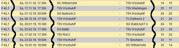 Das Vorrundenspiel in Wilhelmsfeld endete nach einem Tor in letzter Minute mit einem glücklichen 14:15 -Sieg des TSV. Dieser Sieg war der Startpunkt einer beeindruckenden Siegesserie. Die akutelle gute Form unserer Mannschaft zeigen folgende rekordverdächtigen Daten des Rückspieles: