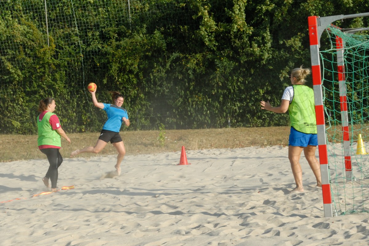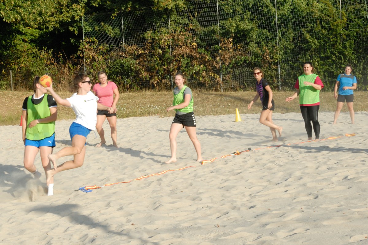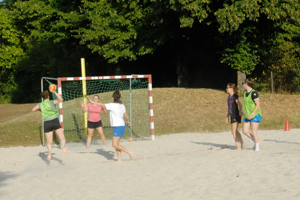 Um auf dem Beachfeld im Sportzentrum Handball spielen zu können, war zunächst eine kleine Krafteinheit erforderlich: Die Volleyballstangen mussten abgebaut und zwei Tore von den Kleinfeldern hingetragen werden. Nach einigen kraftzehrenden Spieleinheiten gelang es, die Fundamente für die Volleyballstangen im tiefen Sand wiederzufinden, so dass die Volleyball-Abteilung, die auf eine Trainingseinheit verzichtet hatte, das Beachfeld wieder für die gewohnte Sportart nutzen kann.