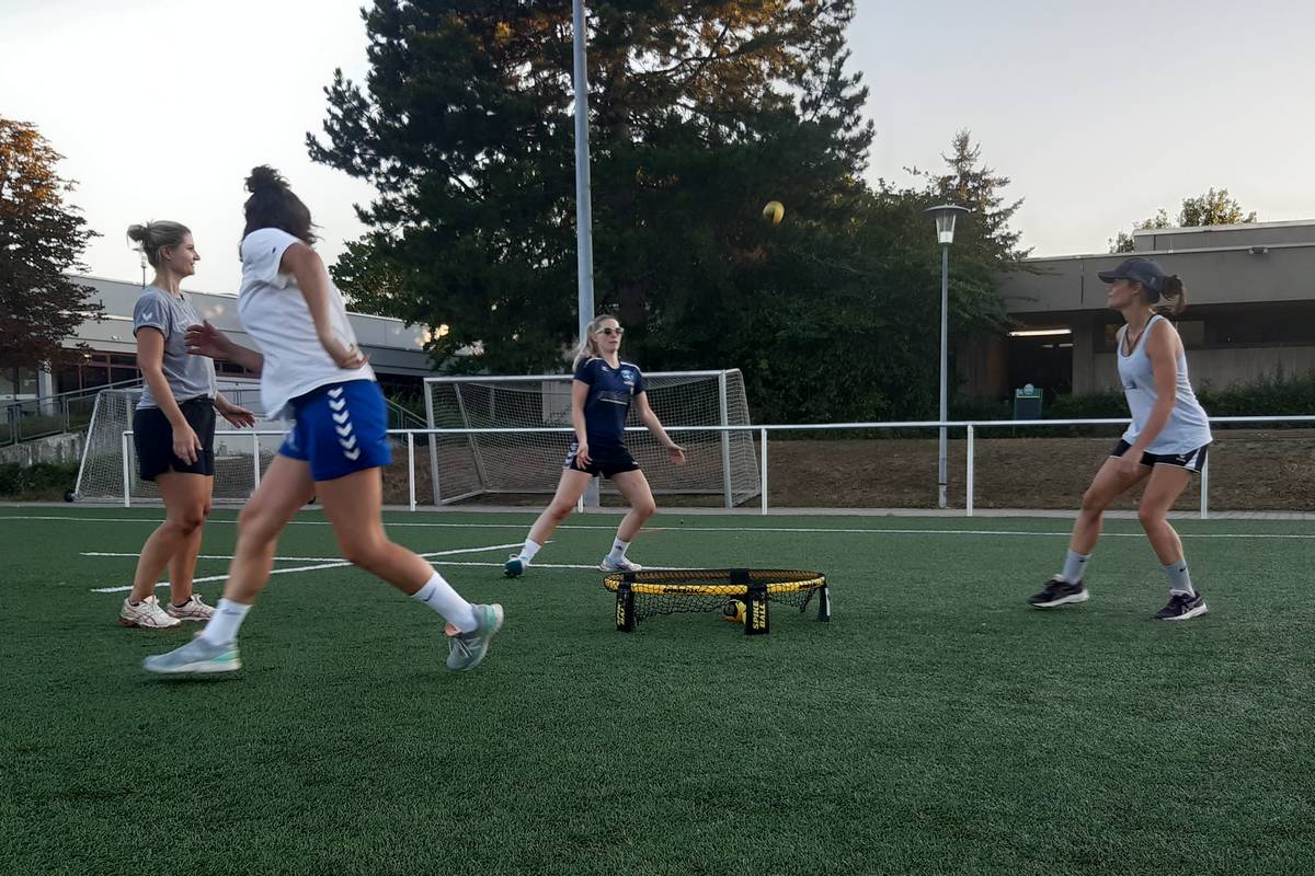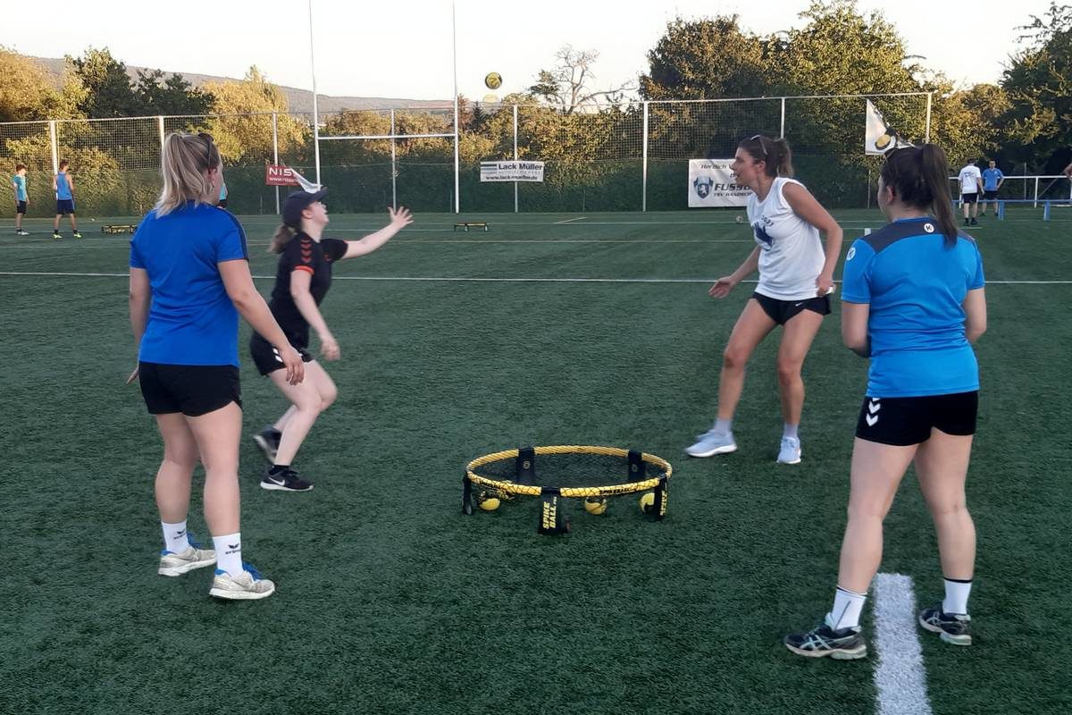 Los ging es auf dem Kunstrasen des Sportzentrums mit einer Schnuppereinheit der neuen TSV-Sportart Roundnet. Mathis Härtling von der Roundnet-Abteilung gab eine umfassende Einführung in Technik, Taktik und Regeln und zeigte dann praktisch, wie es geht. Vielen Dank, Mathis! Relativ schnell gewöhnten sich unsere Spielerinnen an den kleineren Ball und die kleinere Trefferfläche, so dass schon bald ein Spielfluss zu sehen war.