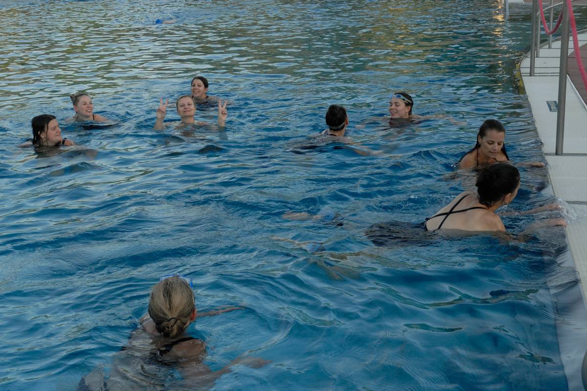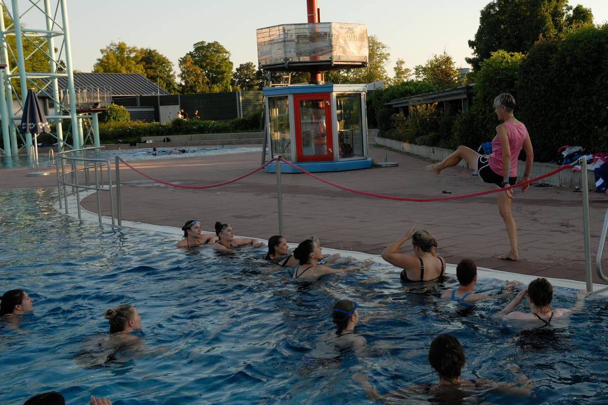Simone Saggau, die ehemalige Leiterin unsere Kindersportschule und jetzige Leiterin der „Wasserkinder“ der TSG Weinheim, übernahm es, die Spielerinnen im gänzlich ungewöhnlichen Element zu fordern. Dank der freundlichen Genehmigung der Stadtwerke Heidelberg durften wir das Tiergarten-Schwimmbad nach dem allgemeinen Badebetrieb gemeinsam mit Wassersport-Vereinen nutzen. Über eine Stunde bewegten sich die Spielerinnen, mit und auch ohne „Beinschwimmer“, im Wasser und versuchten, vorwärtszukommen ohne zu viel Wasser zu schlucken.