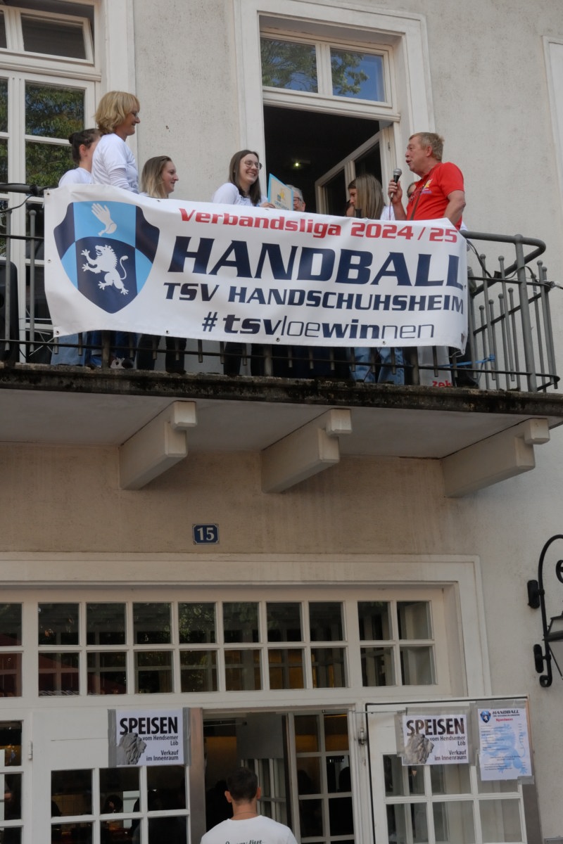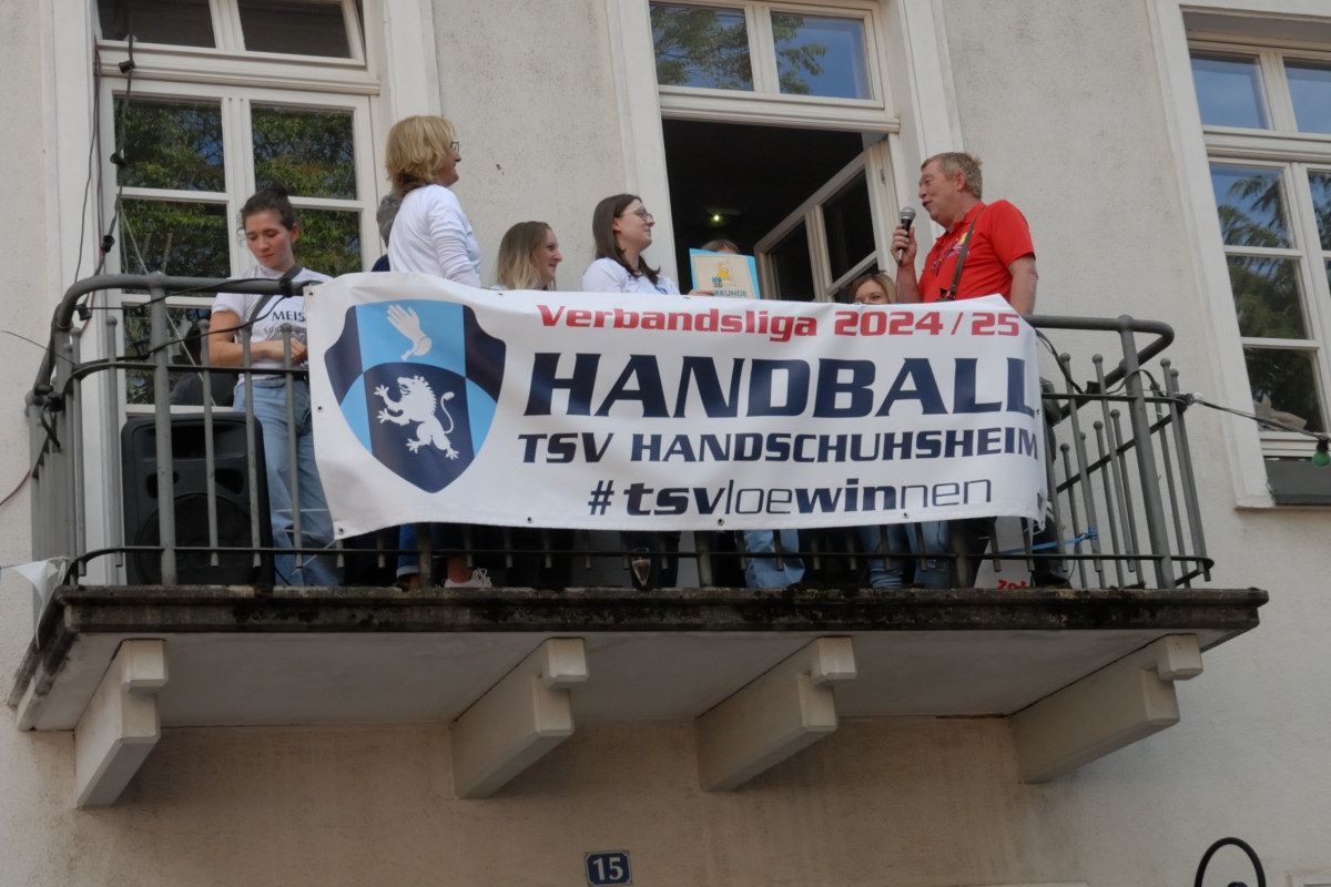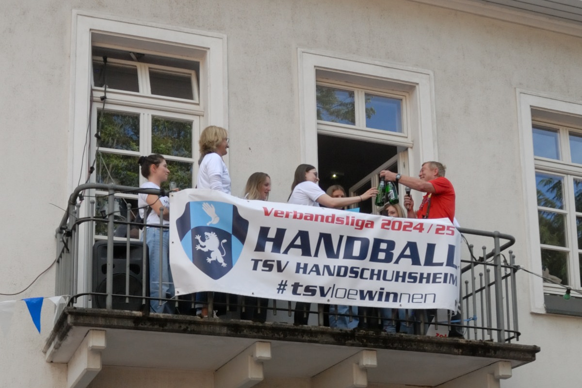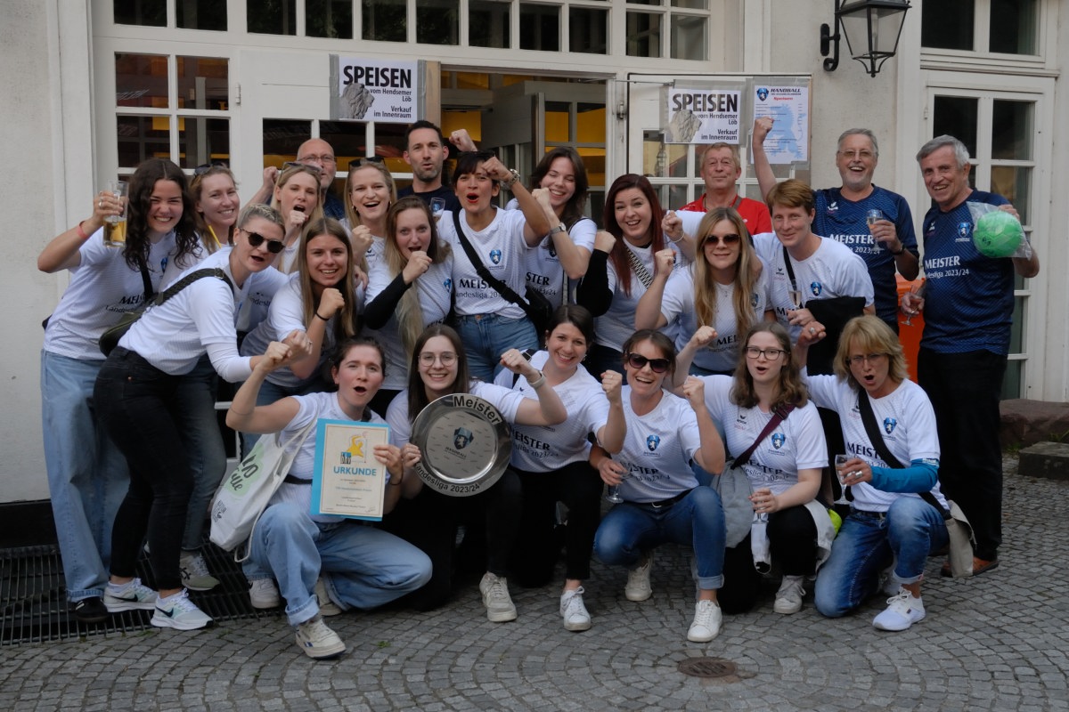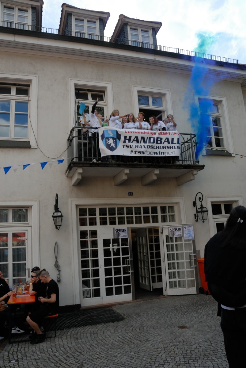 Meisterschaften werden von den Mannschaften ja am Liebsten auf einem Balkon gefeiert. Der Balkon im Schlösselhof ist zwar etwas klein für eine ganze Mannschaft, was der Feierfreude unserer Spielerinnen jedoch keinen Abbruch tat. Vor allem, als Nicole Welsch als erste die von Abteilungsleiterin Martina Graefner gebastelte „Meisterschale“ in die Luft strecken konnte.