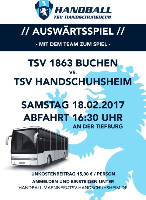 Löwenfans aufgepasst, das neue Jahr startet gleich mit einem Kracher!! Am 18.02.2017 steht die nächste Auswärtsfahrt zusammen mit der Mannschaft an. Dieses Mal geht es nach Buchen und die Mannschaft braucht jeden einzelnen von euch da draußen! Denn dieses Mal wollen wir nicht mit leeren Händen zurück zur Tiefburg fahren. Also zögert nicht und meldet euch unter HANDBALL-MAENNER@TSV-HANDSCHUHSHEIM.DE an.