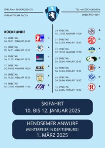 Hier die Termine unserer Männer 1 in der Verbandsliga Baden mit Terminen zu Skifahrt und Tiefburg-Fest: